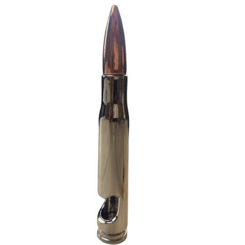 O Abridor de Garrafas Bala de Fuzil Calibre 50 10cm em Metal, é Trabalhado com detalhes e na cor Niquel e ponteira Cobre.
