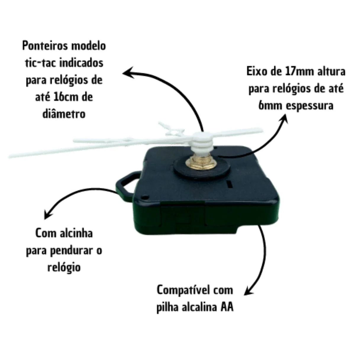Kit Maquina de Relógio Tic Tac Quartz com Alça 17mm (tamanho do eixo) da marca Uniart, acompanha Trio de Ponteiros Universal 7cm Branco. É uma opção perfeita para quem deseja criar seus próprios relógios artesanais. Composto por uma maquinária de alta qualidade, este kit permite que você dê asas à sua criatividade e crie relógios únicos e personalizados. Tamanho da pilha alcalina AA.